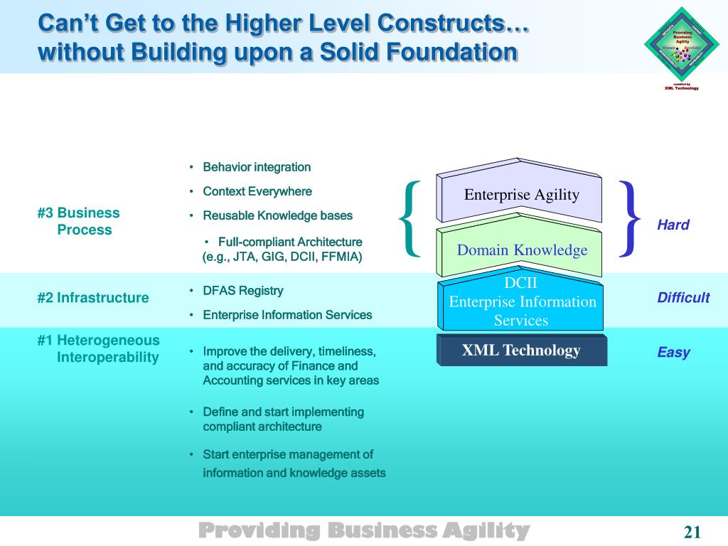 Can’t Get to the Higher Level Constructs… without Building upon a Solid Foundation • Behavior integration { } • Context Everywhere Enterprise Agility #3 Business Process • Reusable Knowledge bases Hard • Full-compliant Architecture (e.g., JTA, GIG, DCII, FFMIA) Domain Knowledge DCII • DFAS Registry #2 Infrastructure Difficult Enterprise Information • Enterprise Information Services Services #1 Heterogeneous Interoperability XML Technology • Improve the delivery, timeliness, and accuracy of Finance and Accounting services in key areas Easy • Define and start implementing compliant architecture • Start enterprise management of information and knowledge assets