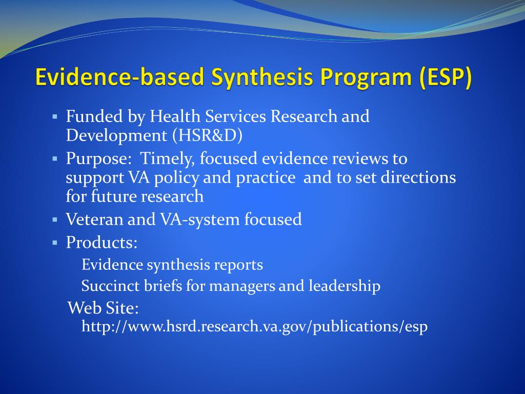 Evidence-based Synthesis Program (ESP) Funded by Health Services Research and Development (HSR&D) Purpose: Timely, focused evidence reviews to support VA policy and practice and to set directions for future research Veteran and VA-system focused Products: Evidence synthesis reports Succinct briefs for managers and leadership Web Site: http://www.hsrd.research.va.gov/publications/esp