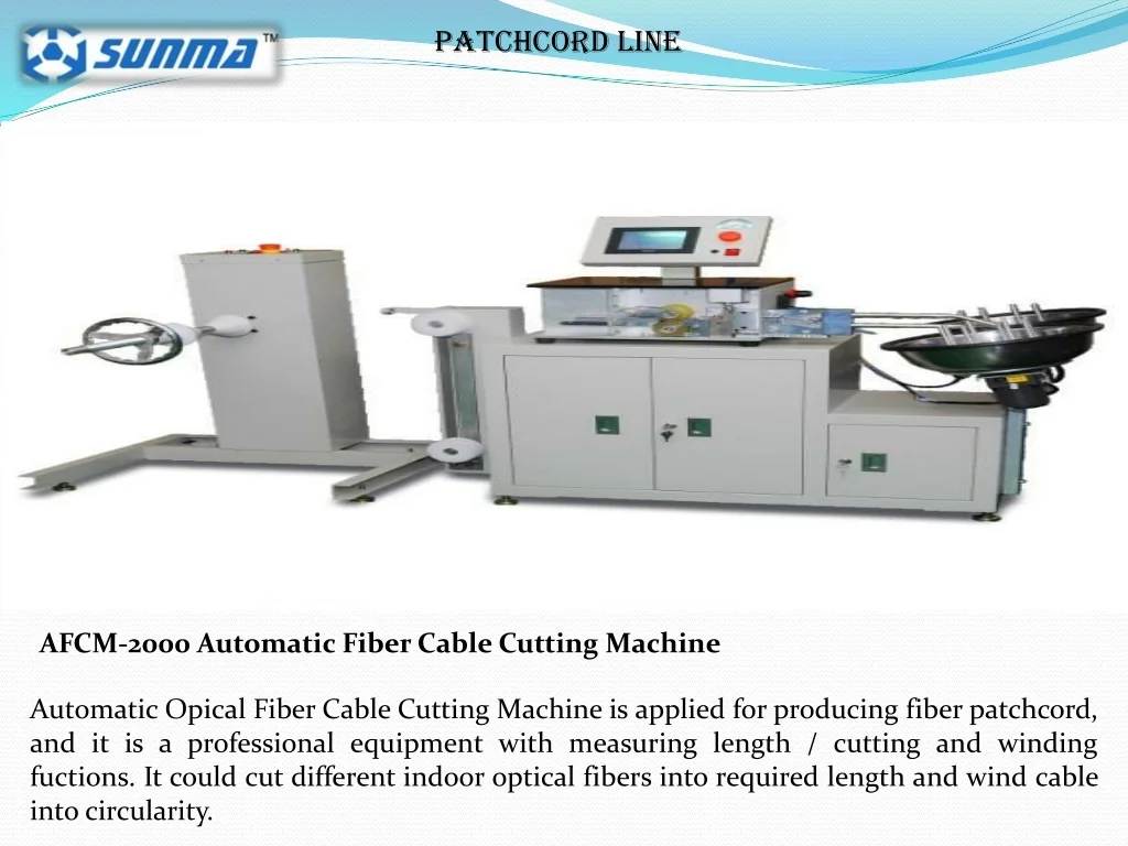 Patchcord Line AFCM-2000 Automatic Fiber Cable Cutting Machine Automatic Opical Fiber Cable Cutting Machine is applied for producing fiber patchcord, and it is a professional equipment with measuring length / cutting and winding fuctions. It could cut different indoor optical fibers into required length and wind cable into circularity.