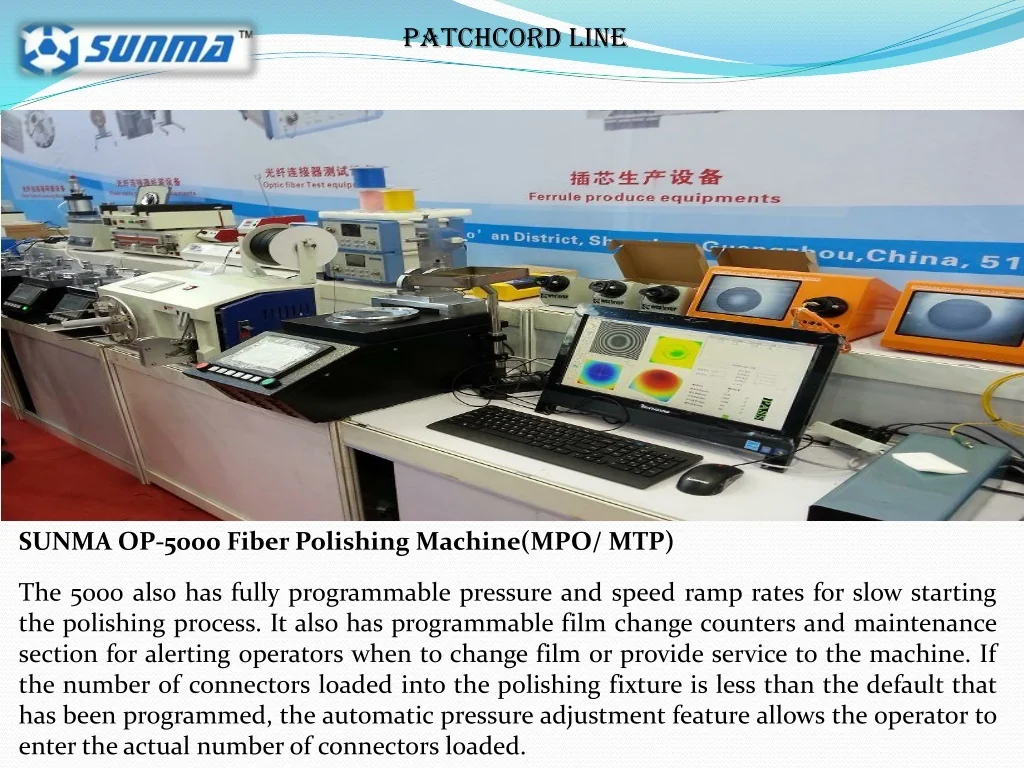 Patchcord Line SUNMA OP-5000 Fiber Polishing Machine(MPO/ MTP) The 5000 also has fully programmable pressure and speed ramp rates for slow starting the polishing process. It also has programmable film change counters and maintenance section for alerting operators when to change film or provide service to the machine. If the number of connectors loaded into the polishing fixture is less than the default that has been programmed, the automatic pressure adjustment feature allows the operator to enter the actual number of connectors loaded.
