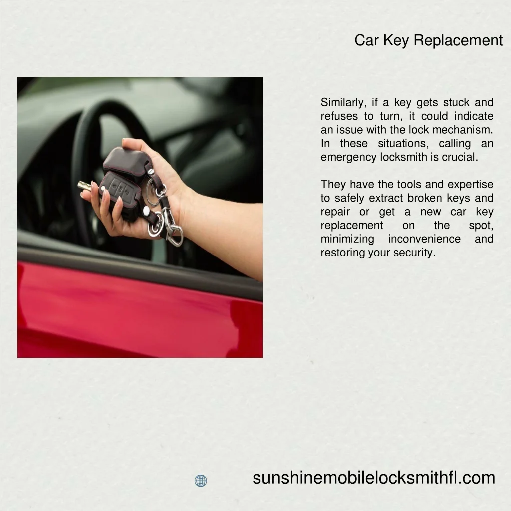 Car Key Replacement Similarly, if a key gets stuck and refuses to turn, it could indicate an issue with the lock mechanism. In these situations, calling an emergency locksmith is crucial. They have the tools and expertise to safely extract broken keys and repair or get a new car key replacement on minimizing inconvenience restoring your security. the spot, and sunshinemobilelocksmithfl.com
