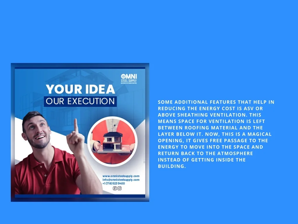 SOME ADDITIONAL FEATURES THAT HELP IN REDUCING THE ENERGY COST IS ASV OR ABOVE SHEATHING VENTILATION. THIS MEANS SPACE FOR VENTILATION IS LEFT BETWEEN ROOFING MATERIAL AND THE LAYER BELOW IT. NOW, THIS IS A MAGICAL OPENING, IT GIVES FREE PASSAGE TO THE ENERGY TO MOVE INTO THE SPACE AND RETURN BACK TO THE ATMOSPHERE INSTEAD OF GETTING INSIDE THE BUILDING.