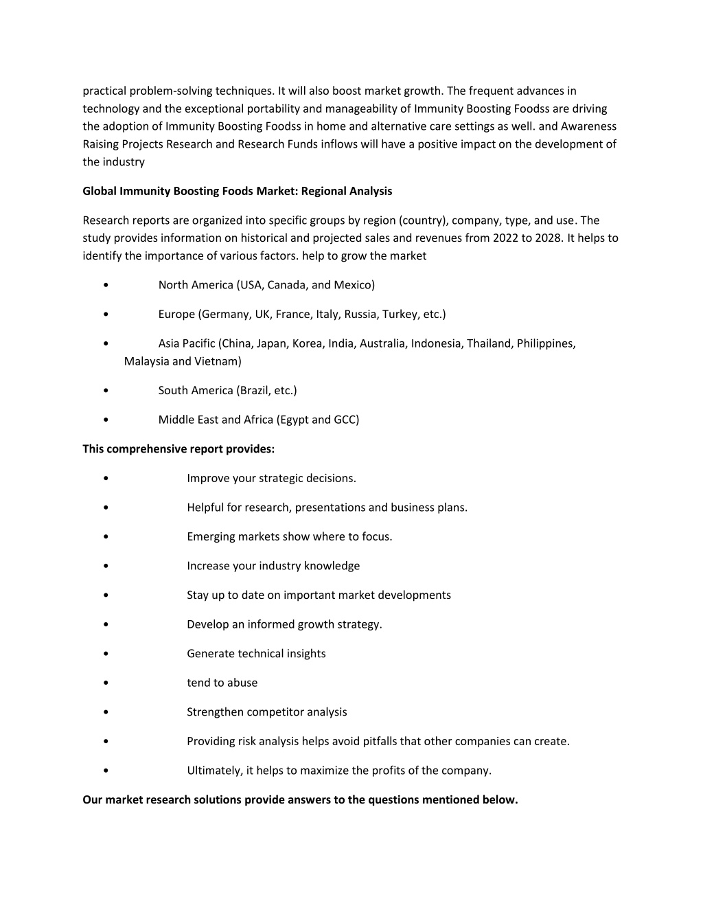 practical problem-solving techniques. It will also boost market growth. The frequent advances in technology and the exceptional portability and manageability of Immunity Boosting Foodss are driving the adoption of Immunity Boosting Foodss in home and alternative care settings as well. and Awareness Raising Projects Research and Research Funds inflows will have a positive impact on the development of the industry Global Immunity Boosting Foods Market: Regional Analysis Research reports are organized into specific groups by region (country), company, type, and use. The study provides information on historical and projected sales and revenues from 2022 to 2028. It helps to identify the importance of various factors. help to grow the market North America (USA, Canada, and Mexico) Europe (Germany, UK, France, Italy, Russia, Turkey, etc.) Asia Pacific (China, Japan, Korea, India, Australia, Indonesia, Thailand, Philippines, Malaysia and Vietnam) South America (Brazil, etc.) Middle East and Africa (Egypt and GCC) This comprehensive report provides: Improve your strategic decisions. Helpful for research, presentations and business plans. Emerging markets show where to focus. Increase your industry knowledge Stay up to date on important market developments Develop an informed growth strategy. Generate technical insights tend to abuse Strengthen competitor analysis Providing risk analysis helps avoid pitfalls that other companies can create. Ultimately, it helps to maximize the profits of the company. Our market research solutions provide answers to the questions mentioned below.