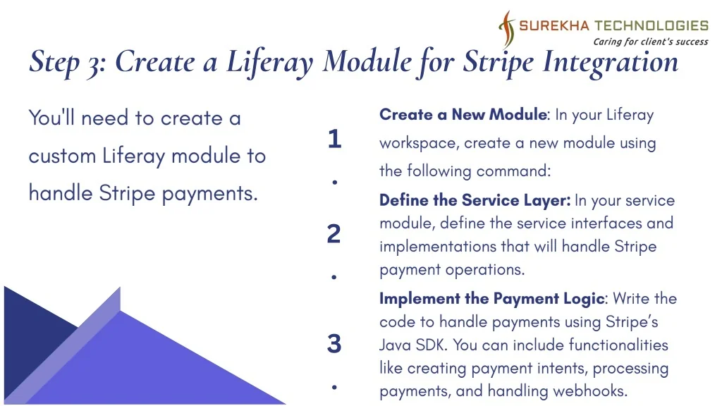 Step 3: Create a Liferay Module for Stripe Integration • You'll need to create a custom Liferay module to handle Stripe payments. • Create a New Module: In your Liferay workspace, create a new module using the following command: 1. • Define the Service Layer: In your service module, define the service interfaces and implementations that will handle Stripe payment operations. 2. • Implement the Payment Logic: Write the code to handle payments using Stripe’s Java SDK. You can include functionalities like creating payment intents, processing payments, and handling webhooks. 3.