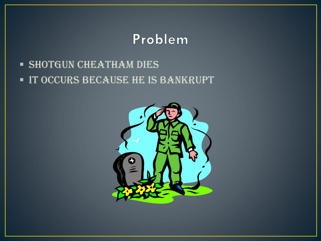Problem • Shotgun Cheatham dies • It occurs because he is bankrupt