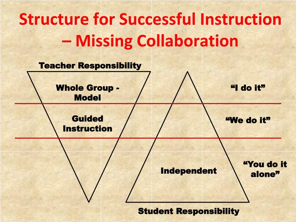 Structure for Successful Instruction – Missing Collaboration Teacher Responsibility Whole Group - Model “I do it” Guided Instruction “We do it” “You do it alone” Independent Student Responsibility