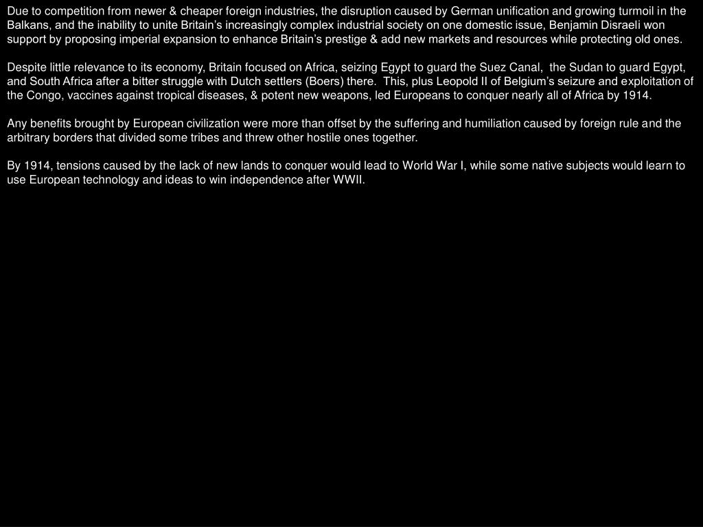 Due to competition from newer & cheaper foreign industries, the disruption caused by German unification and growing turmoil in the Balkans, and the inability to unite Britain’s increasingly complex industrial society on one domestic issue, Benjamin Disraeli won support by proposing imperial expansion to enhance Britain’s prestige & add new markets and resources while protecting old ones. Despite little relevance to its economy, Britain focused on Africa, seizing Egypt to guard the Suez Canal, the Sudan to guard Egypt, and South Africa after a bitter struggle with Dutch settlers (Boers) there. This, plus Leopold II of Belgium’s seizure and exploitation of the Congo, vaccines against tropical diseases, & potent new weapons, led Europeans to conquer nearly all of Africa by 1914. Any benefits brought by European civilization were more than offset by the suffering and humiliation caused by foreign rule and the arbitrary borders that divided some tribes and threw other hostile ones together. By 1914, tensions caused by the lack of new lands to conquer would lead to World War I, while some native subjects would learn to use European technology and ideas to win independence after WWII.