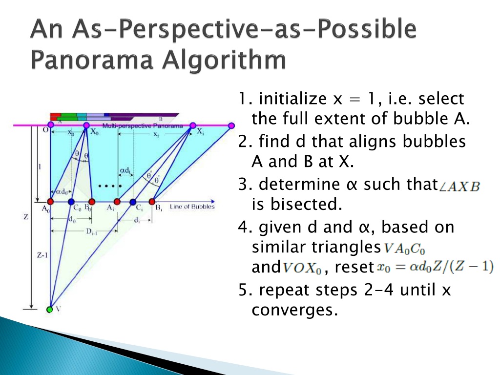 An As-Perspective-as-Possible PanoramaAlgorithm 1. initialize x = 1, i.e. select the full extent of bubble A. 2. find d that aligns bubbles A and B at X. 3. determine αsuch that is bisected. 4. given d and α, based on similar triangles and , reset 5. repeat steps 2-4 until x converges.