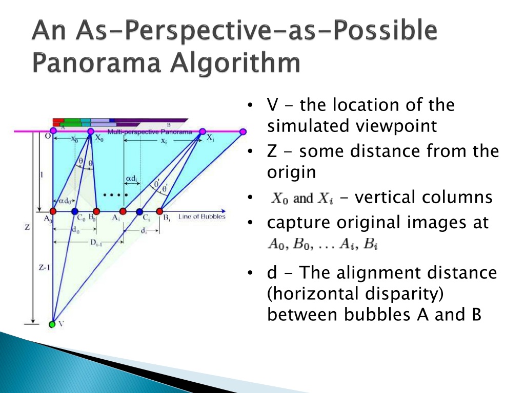An As-Perspective-as-Possible PanoramaAlgorithm • V - the location of the simulated viewpoint • Z - some distance from the origin • - vertical columns • capture original images at • d - The alignment distance (horizontal disparity) between bubbles A and B