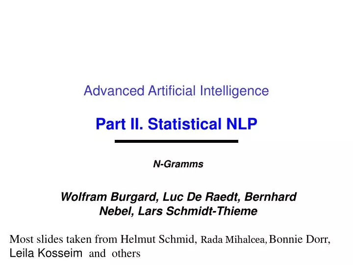 Advanced Artificial Intelligence Part II. Statistical NLP N-Gramms Wolfram Burgard, Luc De Raedt, Bernhard Nebel, Lars Schmidt-Thieme Most slides taken from Helmut Schmid, Rada Mihalcea,Bonnie Dorr, Leila Kosseim and others