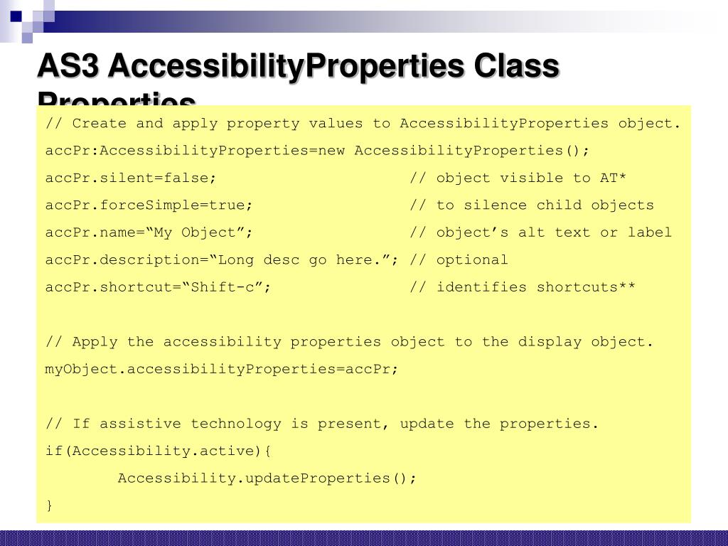 AS3 AccessibilityProperties Class Properties // Create and apply property values to AccessibilityProperties object. accPr:AccessibilityProperties=new AccessibilityProperties(); accPr.silent=false; // object visible to AT* accPr.forceSimple=true; // to silence child objects accPr.name=“My Object”; // object’s alt text or label accPr.description=“Long desc go here.”; // optional accPr.shortcut=“Shift-c”; // identifies shortcuts** // Apply the accessibility properties object to the display object. myObject.accessibilityProperties=accPr; // If assistive technology is present, update the properties. if(Accessibility.active){ Accessibility.updateProperties(); }