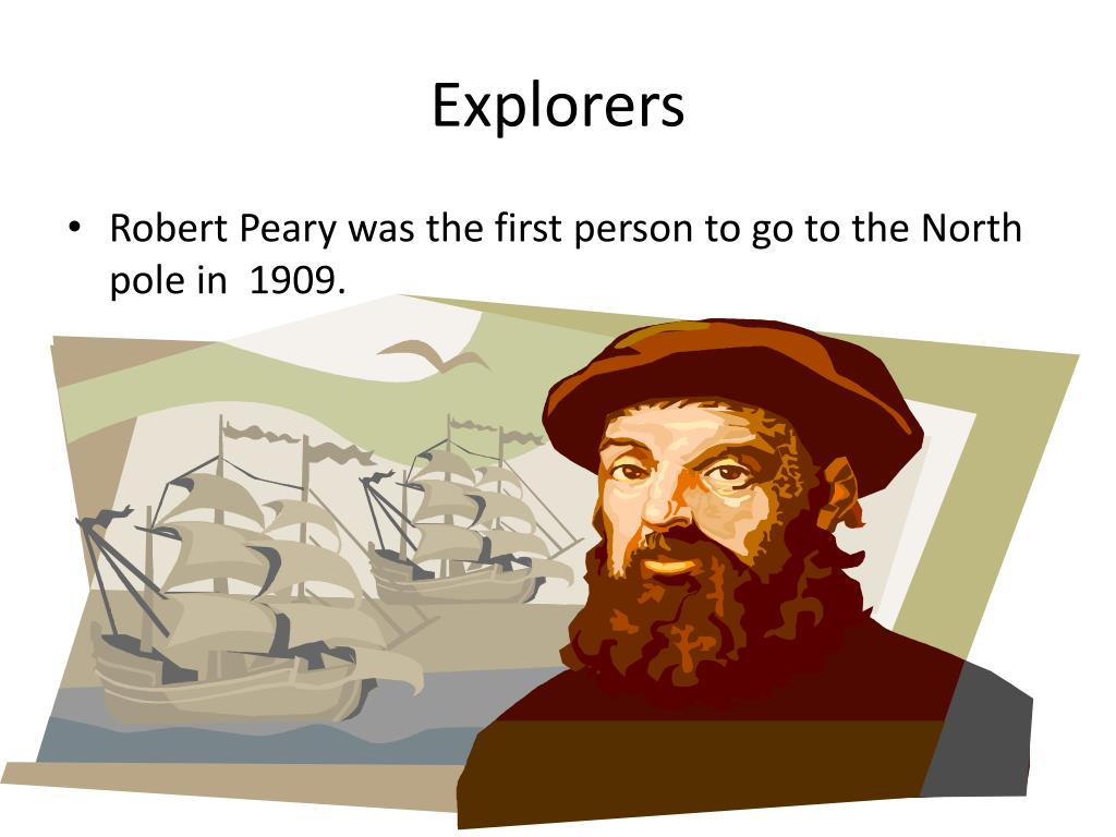 Explorers • Robert Peary was the first person to go to the North pole in 1909.