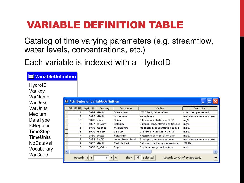 Variable Definition table • Catalog of time varying parameters (e.g. streamflow, water levels, concentrations, etc.) • Each variable is indexed with a HydroID