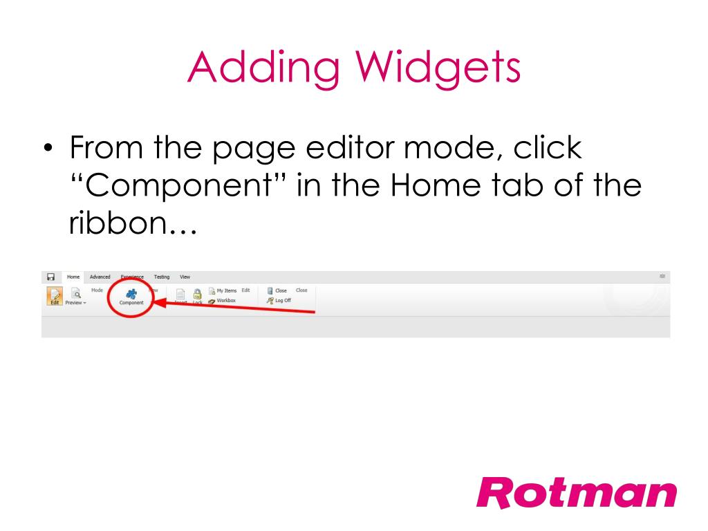 Adding Widgets • From the page editor mode, click “Component” in the Home tab of the ribbon…