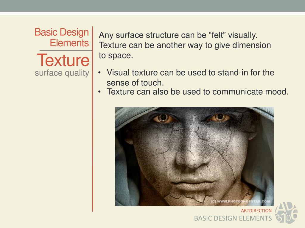 Basic Design Elements Any surface structure can be “felt” visually. Texture can be another way to give dimension to space. Texture • Visual texture can be used to stand-in for the sense of touch. • Texture can also be used to communicate mood. surface quality ARTDIRECTIONBASIC DESIGN ELEMENTS