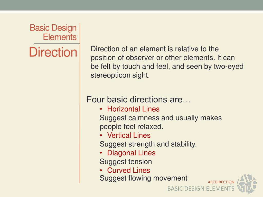 Basic Design Elements Direction of an element is relative to the position of observer or other elements. It can be felt by touch and feel, and seen by two-eyed stereopticon sight. Direction • Four basic directions are… • Horizontal Lines • Suggest calmness and usually makes people feel relaxed. • Vertical Lines • Suggest strength and stability. • Diagonal Lines • Suggest tension • Curved Lines • Suggest flowing movement ARTDIRECTIONBASIC DESIGN ELEMENTS