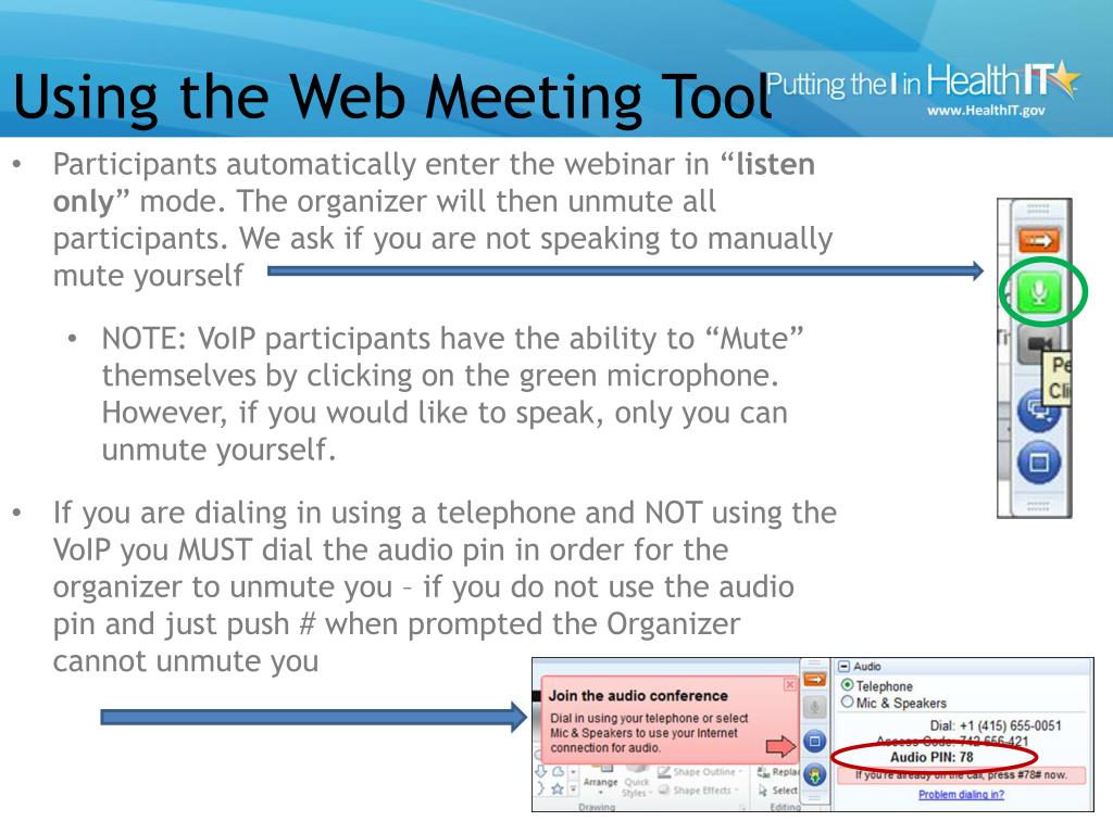 Using the Web Meeting Tool • Participants automatically enter the webinar in “listen only” mode. The organizer will then unmute all participants. We ask if you are not speaking to manually mute yourself • NOTE: VoIP participants have the ability to “Mute” themselves by clicking on the green microphone. However, if you would like to speak, only you can unmute yourself. • If you are dialing in using a telephone and NOT using the VoIP you MUST dial the audio pin in order for the organizer to unmute you – if you do not use the audio pin and just push # when prompted the Organizer cannot unmute you