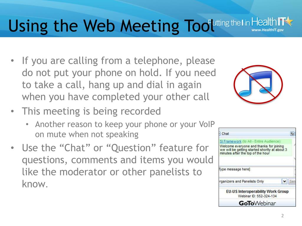 Using the Web Meeting Tool • If you are calling from a telephone, please do not put your phone on hold. If you need to take a call, hang up and dial in again when you have completed your other call • This meeting is being recorded • Another reason to keep your phone or your VoIP on mute when not speaking • Use the “Chat” or “Question” feature for questions, comments and items you would like the moderator or other panelists to know.
