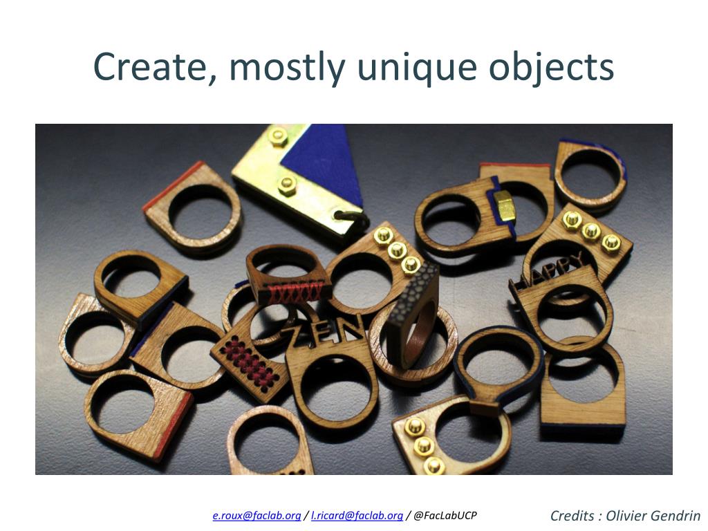 Create, mostly unique objects Credits : Olivier Gendrin e.roux@faclab.org / l.ricard@faclab.org / @FacLabUCP