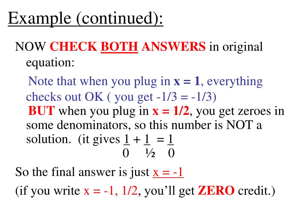 Example (continued): NOW CHECKBOTH ANSWERS in original equation: Note that when you plug in x = 1, everything checks out OK ( you get -1/3 = -1/3) BUT when you plug in x = 1/2, you get zeroes in some denominators, so this number is NOT a solution. (it gives 1 + 1 = 1 0 ½ 0 So the final answer is just x = -1 (if you write x = -1, 1/2, you’ll get ZERO credit.)