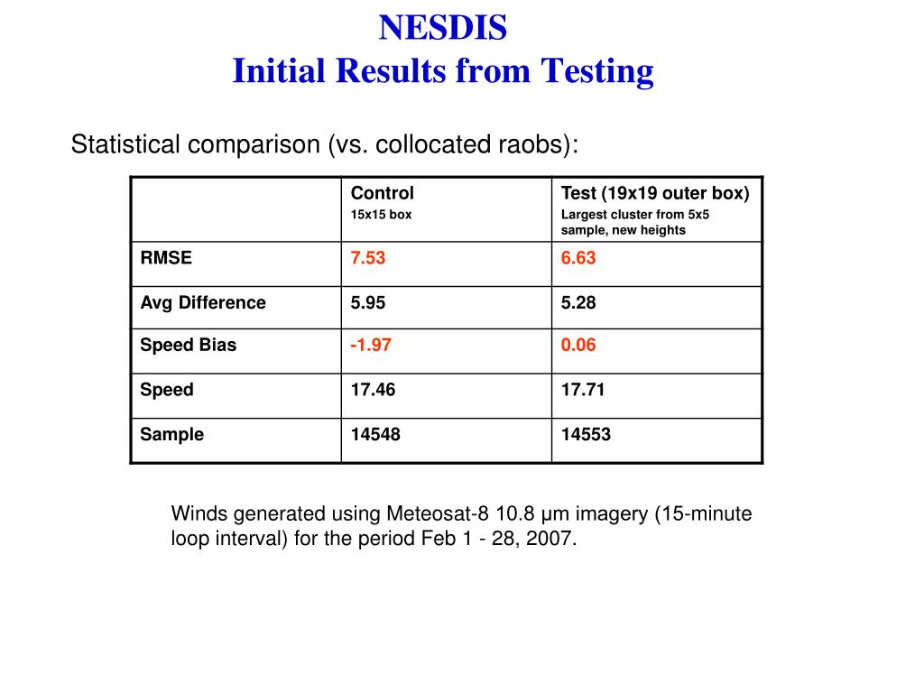 NESDISInitial Results from Testing Statistical comparison (vs. collocated raobs): Winds generated using Meteosat-8 10.8 μm imagery (15-minute loop interval) for the period Feb 1 - 28, 2007.