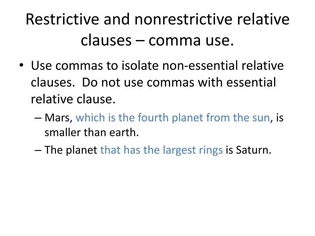 Restrictive and nonrestrictive relative clauses – comma use. • Use commas to isolate non-essential relative clauses. Do not use commas with essential relative clause. • Mars, which is the fourth planet from the sun, is smaller than earth. • The planet that has the largest rings is Saturn.