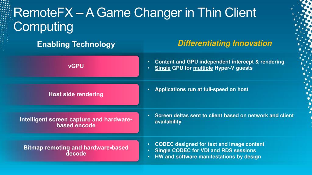 RemoteFX – A Game Changer in Thin Client Computing Enabling Technology Organizational Value Full rich Windows experience vGPU Remoting any content Host side rendering High fidelity user experience Intelligent screen capture and hardware-based encode Full range of client devices Bitmap remoting and hardware-based decode