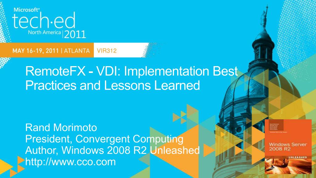 VIR312. RemoteFX - VDI: Implementation Best Practices and Lessons Learned. Rand Morimoto President, Convergent Computing Author, Windows 2008 R2 Unleashed http://www.cco.com. Agenda. Quick Background on Microsoft VDI & RemoteFX Behind the Scenes on How MS-VDI & RemoteFX Work
