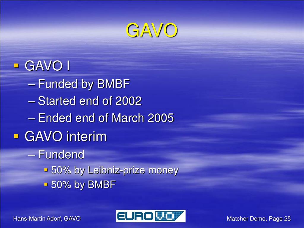 GAVO • GAVO I • Funded by BMBF • Started end of 2002 • Ended end of March 2005 • GAVO interim • Fundend • 50% by Leibniz-prize money • 50% by BMBF