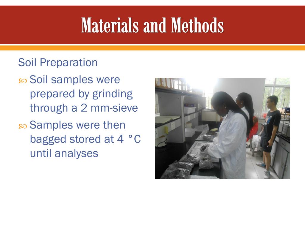 Materials and Methods Soil Preparation • Soil samples were prepared by grinding through a 2 mm-sieve • Samples were then bagged stored at 4 °C until analyses