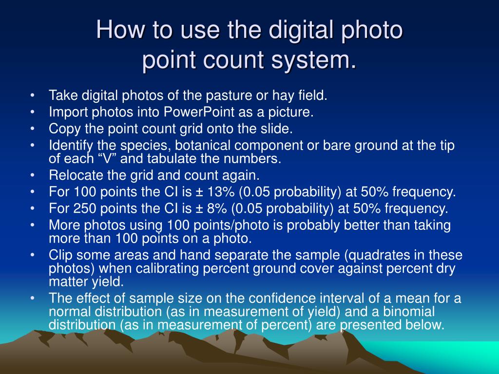 How to use the digital photo point count system. • Take digital photos of the pasture or hay field. • Import photos into PowerPoint as a picture. • Copy the point count grid onto the slide. • Identify the species, botanical component or bare ground at the tip of each “V” and tabulate the numbers. • Relocate the grid and count again. • For 100 points the CI is ± 13% (0.05 probability) at 50% frequency. • For 250 points the CI is ± 8% (0.05 probability) at 50% frequency. • More photos using 100 points/photo is probably better than taking more than 100 points on a photo. • Clip some areas and hand separate the sample (quadrates in these photos) when calibrating percent ground cover against percent dry matter yield. • The effect of sample size on the confidence interval of a mean for a normal distribution (as in measurement of yield) and a binomial distribution (as in measurement of percent) are presented below.