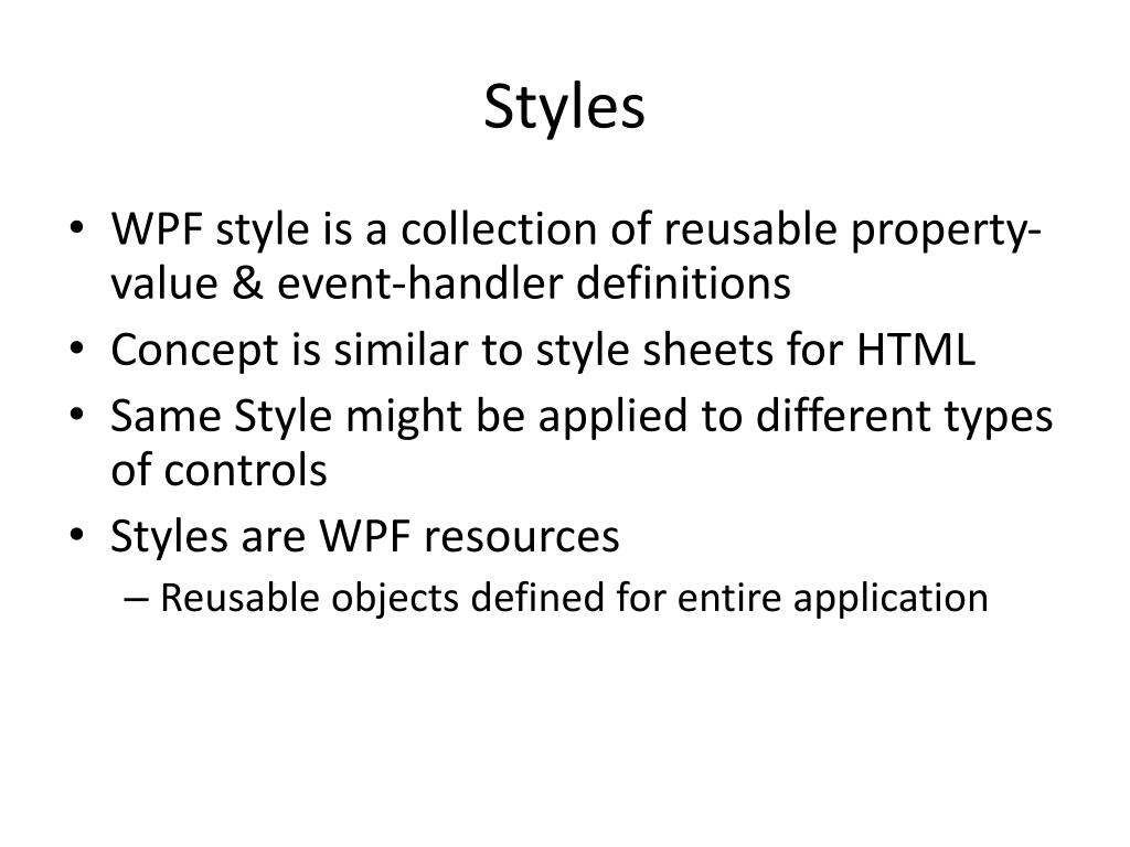 Styles Example 1 <Window.Resources> <Style x:Key="WashedOut" TargetType="{x:TypeFrameworkElement}" > <Setter Property="Opacity" Value="0.5" /> </Style> </Window.Resources> <Slider Name="button1" Content="Button" Style="{StaticResourceWashedOut}" /> <Slider Name="label1"Content="Label" Style="{StaticResourceWashedOut}" /> <Slider Name="checkBox1" Content="CheckBox" Style="{StaticResourceWashedOut}" /> Same style applied to different controls