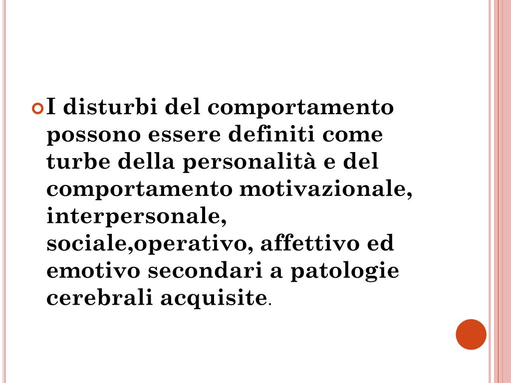 I disturbi del comportamento possono essere definiti come turbe della personalità e del comportamento motivazionale, interpersonale, sociale,operativo, affettivo ed emotivo secondari a patologie cerebrali acquisite.