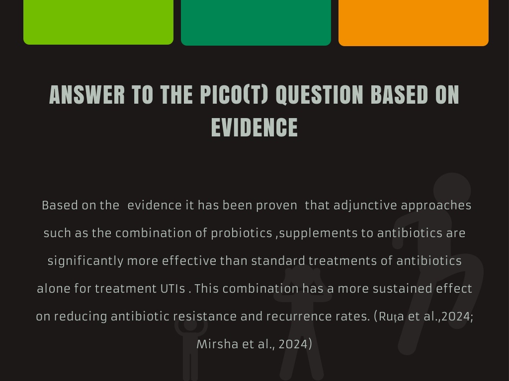ANSWER TO THE PICO(T) QUESTION BASED ON EVIDENCE Based on the evidence it has been proven that adjunctive approaches such as the combination of probiotics ,supplements to antibiotics are significantly more effective than standard treatments of antibiotics alone for treatment UTIs . This combination has a more sustained effect on reducing antibiotic resistance and recurrence rates. (Ruța et al.,2024; Mirsha et al., 2024)