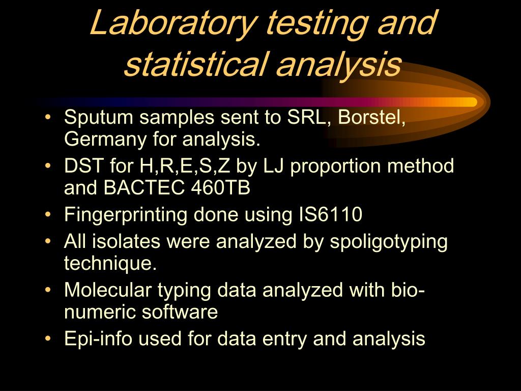 Laboratory testing and statistical analysis • Sputum samples sent to SRL, Borstel, Germany for analysis. • DST for H,R,E,S,Z by LJ proportion method and BACTEC 460TB • Fingerprinting done using IS6110 • All isolates were analyzed by spoligotyping technique. • Molecular typing data analyzed with bio-numeric software • Epi-info used for data entry and analysis