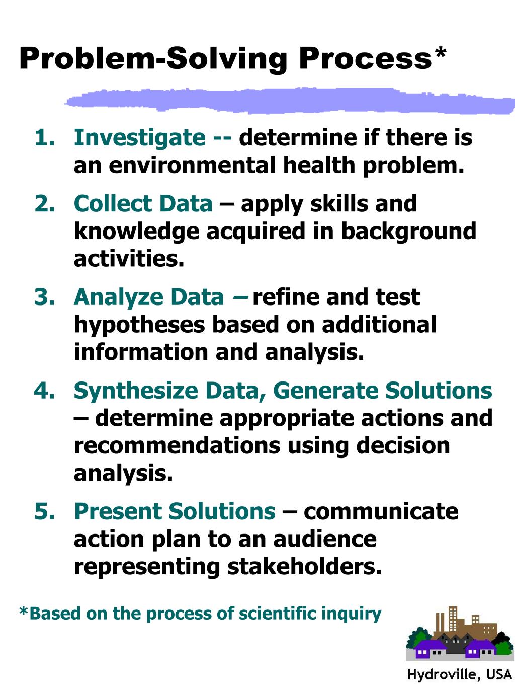 Problem-Solving Process* • Investigate -- determine if there is an environmental health problem. • Collect Data – apply skills and knowledge acquired in background activities. • Analyze Data – refine and test hypotheses based on additional information and analysis. • Synthesize Data, Generate Solutions – determine appropriate actions and recommendations using decision analysis. • Present Solutions–communicate action plan to an audience representing stakeholders. *Based on the process of scientific inquiry