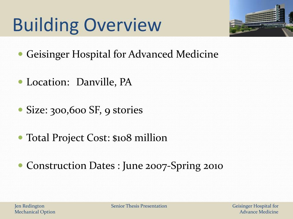 Building Overview • Geisinger Hospital for Advanced Medicine • Location: Danville, PA • Size: 300,600 SF, 9 stories • Total Project Cost: $108 million • Construction Dates : June 2007-Spring 2010 Senior Thesis Presentation