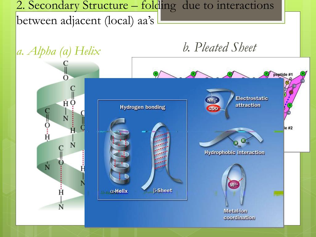 2. Secondary Structure – folding due to interactions between adjacent (local) aa’sa. Alpha (α) Helix b. Pleated Sheet