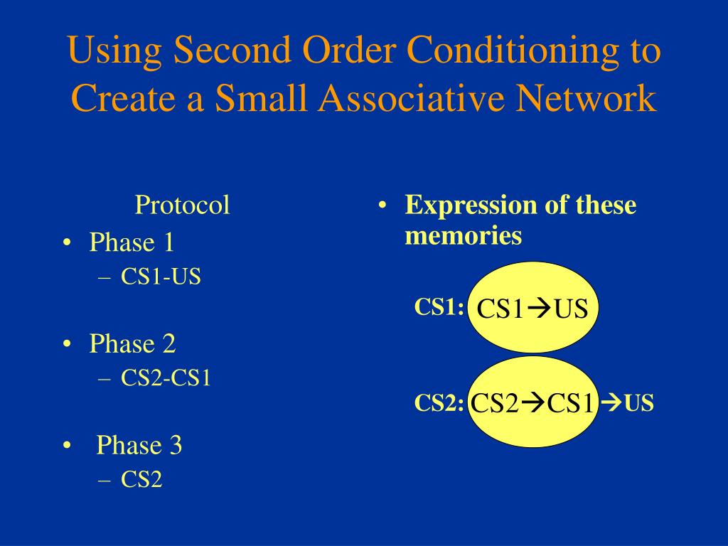 Protocol Phase 1 CS1-US Phase 2 CS2-CS1 Phase 3 CS2 Expression of these memories CS1: CS1US CS2: CS2CS1 US Using Second Order Conditioning to Create a Small Associative Network CS1US CS2CS1