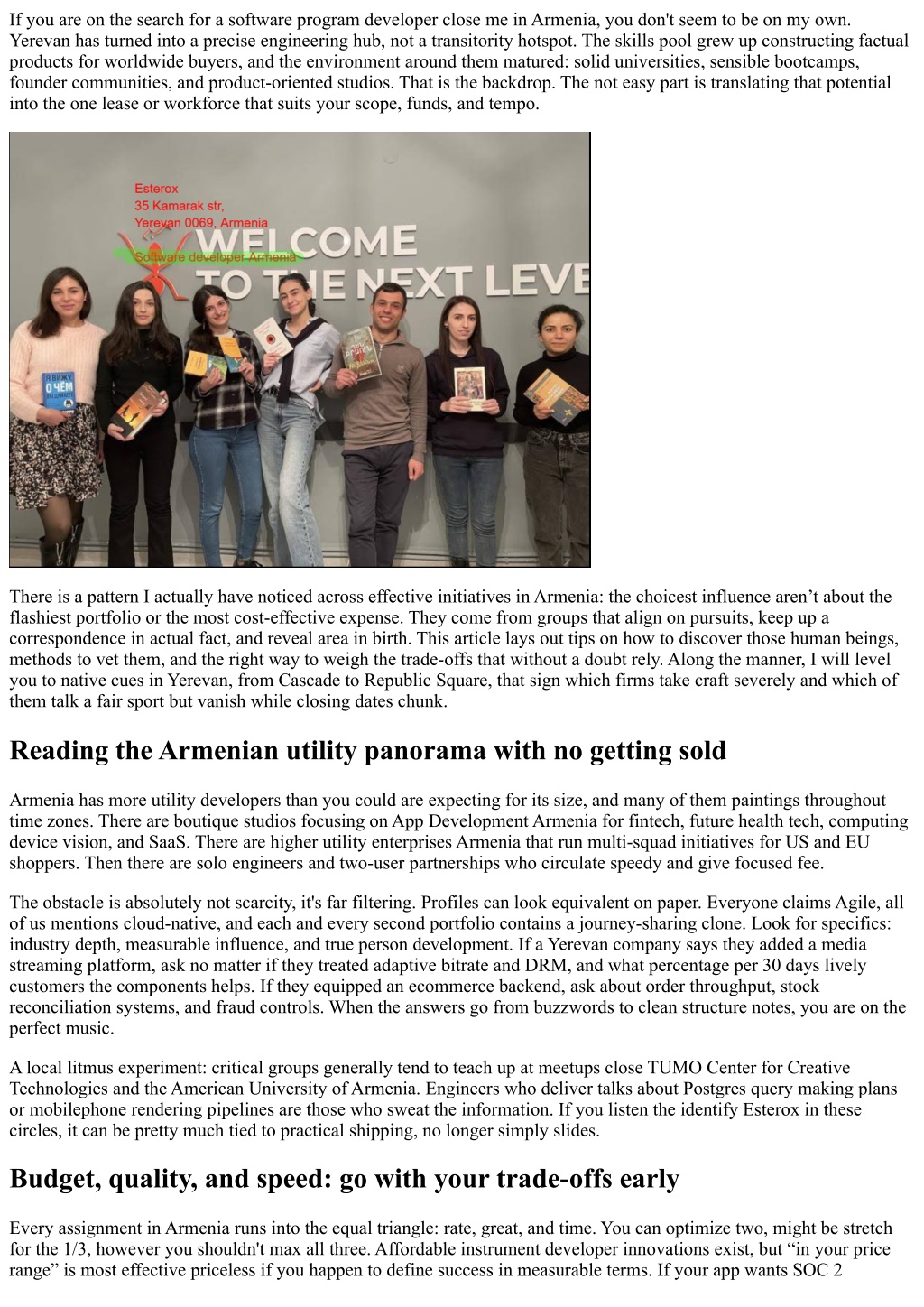 be aware travels from coworking areas close Cascade to workplaces round Baghramyan Avenue rapid. That pressure tends to retailer best top. The infrastructure is there too. Reliable internet, get right of entry to to substantive cloud structures, and a tradition that respects time cut-off dates. Combine this with lessen working expenditures, and you can actually build formidable application at a speed and price that compare neatly globally. NAP and map for neighborhood engagement Esterox 35 Kamarak str, Yerevan 0069, Armenia Phone +37455665305 If you are virtually critical Yerevan, it's a brief ride from Republic Square or the Opera House, and the course beyond the Cascade steps is a reminder that this town builds things that final. Bringing all of it together Finding the perfect Software developer Armenia associate isn't very about success. It is trend attention. You want teams that speak in specifics, try on actual devices, device from the get started, and write code you're able to care for. You favor a pricing variety that aligns incentives, and a cadence that exposes disorders early. You favor those who train up to the paintings the related method they display as much as a design evaluation in a café off Northern Avenue: ready, curious, and unafraid of exhausting questions.