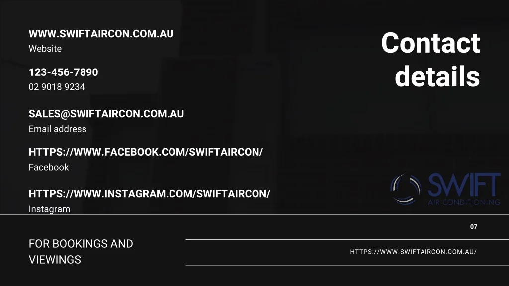 SALES@SWIFTAIRCON.COM.AU HTTPS://WWW.FACEBOOK.COM/SWIFTAIRCON/ HTTPS://WWW.INSTAGRAM.COM/SWIFTAIRCON/ Email address Facebook Instagram WWW.SWIFTAIRCON.COM.AU Contact details Website 123-456-7890 02 9018 9234 07 FOR BOOKINGS AND VIEWINGS HTTPS://WWW.SWIFTAIRCON.COM.AU/
