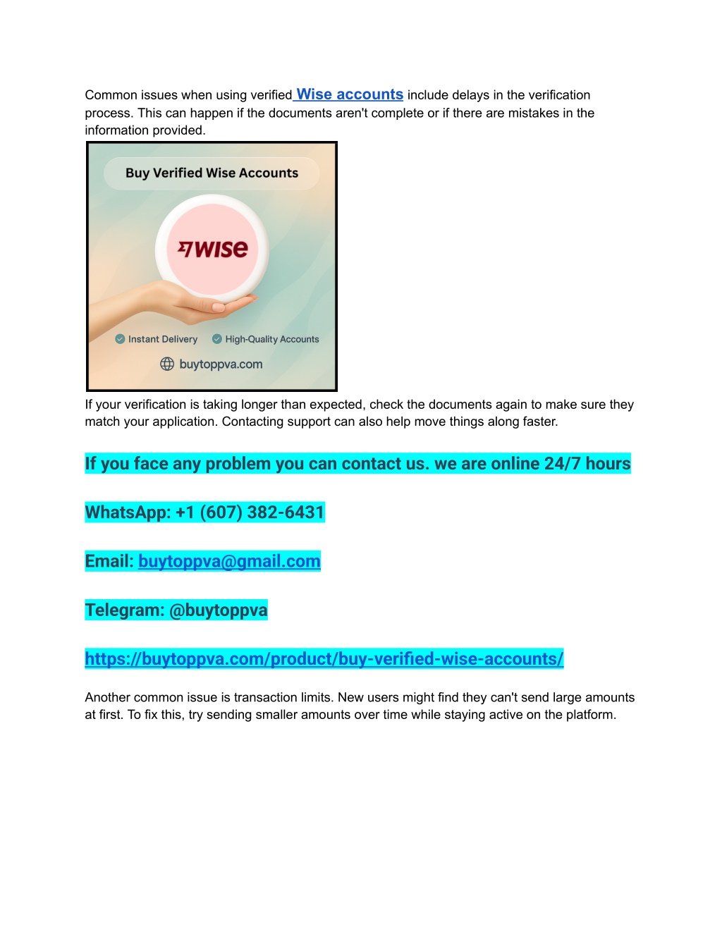 Common issues when using verified Wise accounts include delays in the verification process. This can happen if the documents aren't complete or if there are mistakes in the information provided. If your verification is taking longer than expected, check the documents again to make sure they match your application. Contacting support can also help move things along faster. If you face any problem you can contact us. we are online 24/7 hours WhatsApp: +1 (607) 382-6431 Email: buytoppva@gmail.com Telegram: @buytoppva https://buytoppva.com/product/buy-verified-wise-accounts/ Another common issue is transaction limits. New users might find they can't send large amounts at first. To fix this, try sending smaller amounts over time while staying active on the platform.