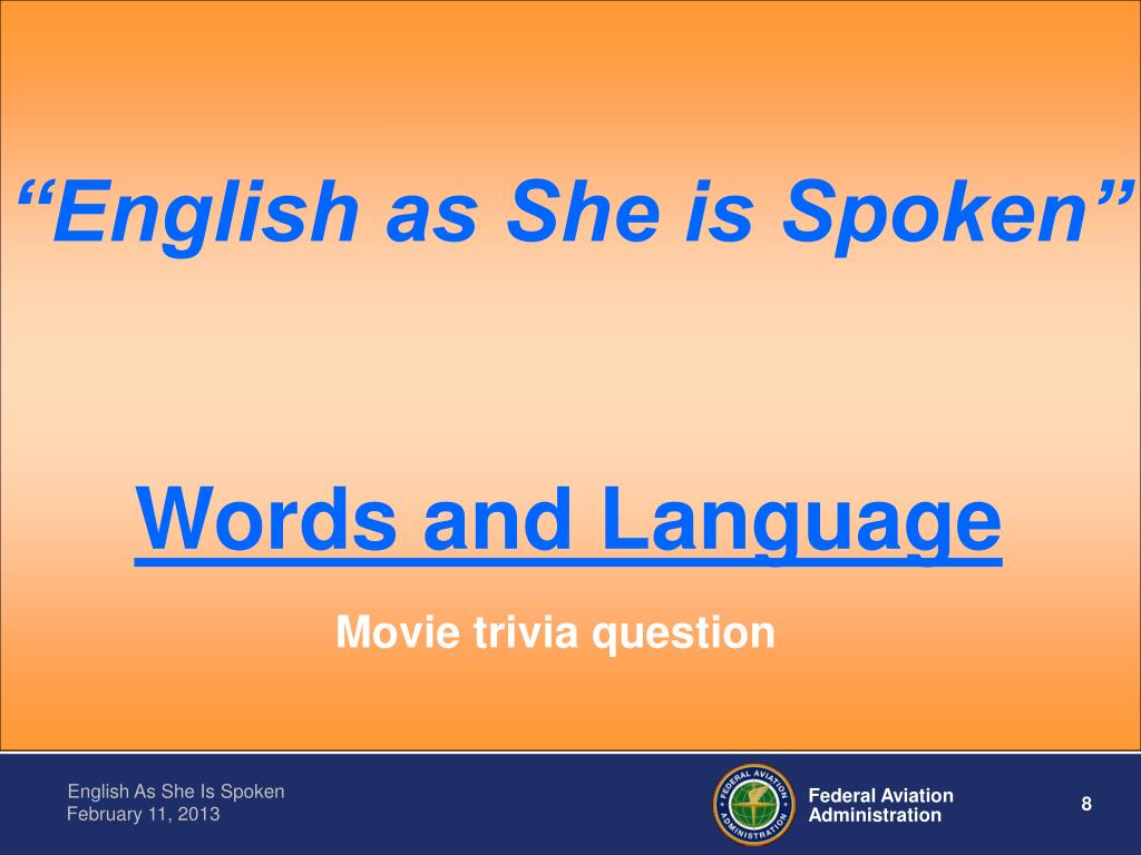 ATC Phraseology. English as She Is Spoken. DPE Meeting. Communication & Runway Safety. Language of Aviation. What thoughts come to mind? English being the ICAO – prescribed official language of global aviation. The peculiar jargon unique to our preferred pastime. Language of Aviation.