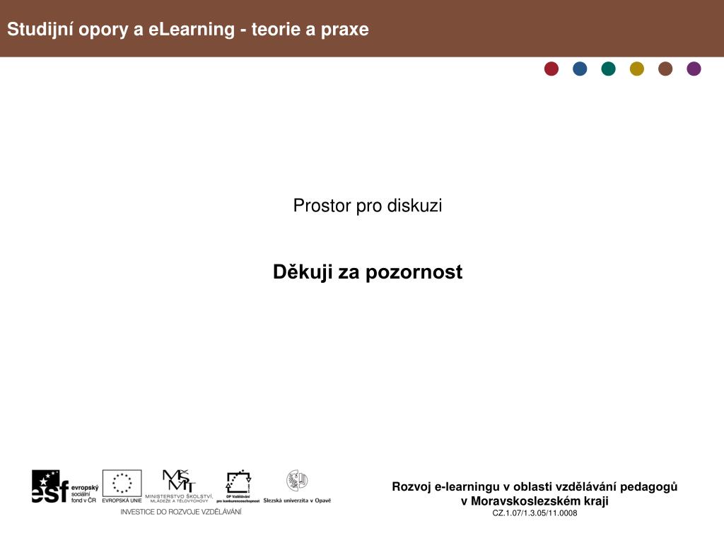Studijní opory a eLearning - teorie a praxe Prostor pro diskuzi Děkuji za pozornost Rozvoj e-learningu v oblasti vzdělávání pedagogů v Moravskoslezském kraji CZ.1.07/1.3.05/11.0008