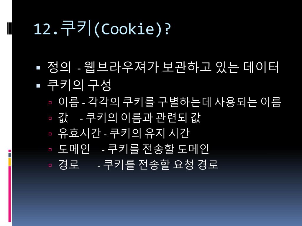 12.쿠키(Cookie)? • 정의 - 웹브라우져가보관하고 있는 데이터 • 쿠키의 구성 • 이름 - 각각의 쿠키를 구별하는데 사용되는 이름 • 값 - 쿠키의 이름과 관련되 값 • 유효시간 - 쿠키의 유지 시간 • 도메인 - 쿠키를 전송할 도메인 • 경로 - 쿠키를 전송할 요청 경로