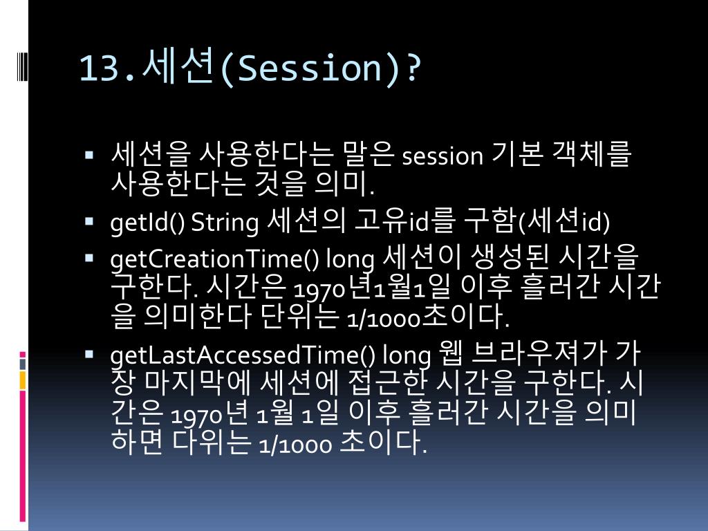 13.세션(Session)? • 세션을 사용한다는 말은 session 기본 객체를 사용한다는 것을 의미. • getId() String 세션의 고유id를 구함(세션id) • getCreationTime() long 세션이 생성된 시간을 구한다. 시간은 1970년1월1일 이후 흘러간 시간을 의미한다 단위는 1/1000초이다. • getLastAccessedTime() long 웹 브라우져가 가장 마지막에 세션에 접근한 시간을 구한다. 시간은 1970년 1월 1일 이후 흘러간 시간을 의미하면 다위는 1/1000 초이다.