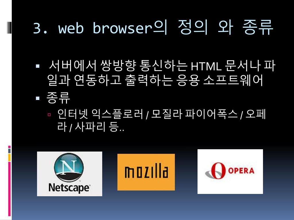 3. web browser의 정의 와 종류 • 서버에서 쌍방향 통신하는 HTML 문서나 파일과 연동하고 출력하는 응용 소프트웨어 • 종류 • 인터넷 익스플로러/ 모질라 파이어폭스/ 오페라 / 사파리 등..