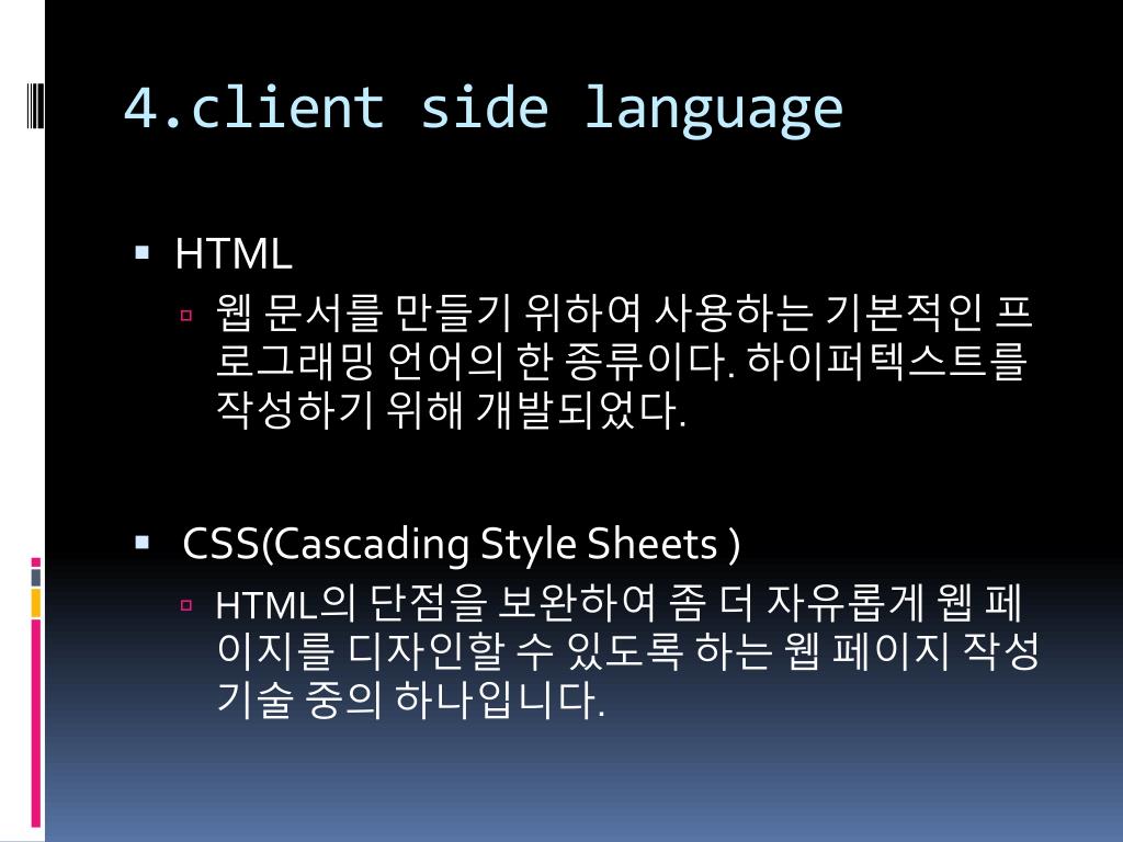 4.client side language • HTML • 웹 문서를 만들기 위하여 사용하는 기본적인 프로그래밍 언어의 한 종류이다. 하이퍼텍스트를 작성하기 위해 개발되었다. • CSS(Cascading Style Sheets ) • HTML의 단점을 보완하여 좀 더 자유롭게 웹 페이지를 디자인할 수 있도록 하는 웹 페이지 작성 기술 중의 하나입니다.