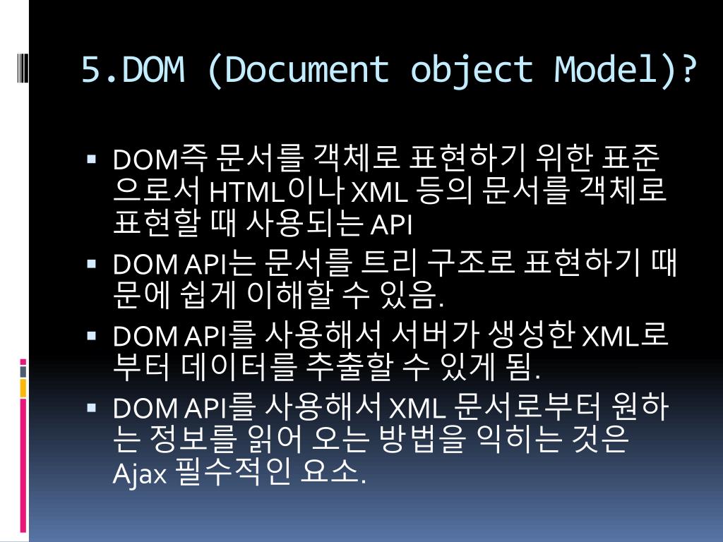 5.DOM (Document object Model)? • DOM즉 문서를 객체로 표현하기 위한 표준으로서 HTML이나 XML 등의 문서를 객체로 표현할 때 사용되는 API • DOM API는 문서를 트리 구조로 표현하기 때문에 쉽게 이해할 수 있음. • DOM API를 사용해서 서버가 생성한 XML로 부터 데이터를 추출할 수 있게 됨. • DOM API를 사용해서 XML 문서로부터 원하는 정보를 읽어 오는 방법을 익히는 것은 Ajax 필수적인 요소.