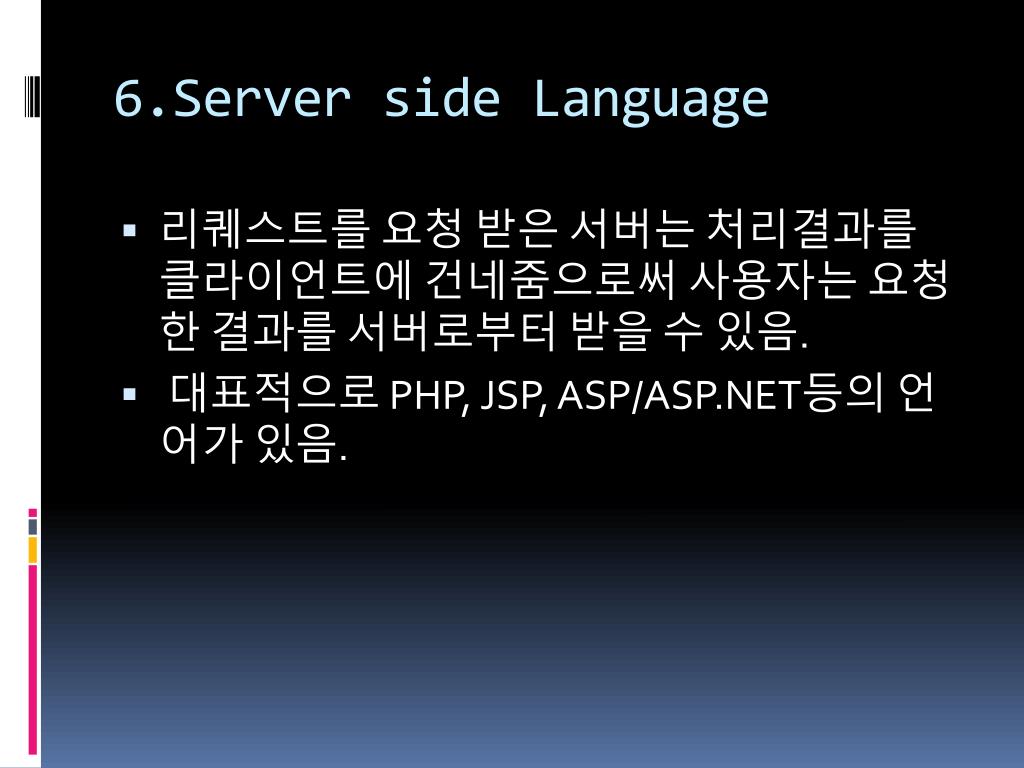 6.Server side Language • 리퀘스트를요청 받은 서버는 처리결과를 클라이언트에 건네줌으로써 사용자는 요청한 결과를 서버로부터 받을 수 있음. • 대표적으로 PHP, JSP, ASP/ASP.NET등의 언어가 있음.